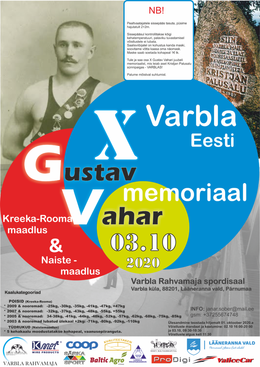 10. Gustav Vahari memoriaal kreeka-rooma ja naistemaadluses. Pealtvaatajatele sissepääs tasuta, püsime hajutatult 2+2m. Sissepääsul kontrollitakse kõigi kehatemperatuuri, palaviku tuvastamisel võistlustele ei lubata! Saalisviibijatel on kohustus kanda maski, soovitame võtta kaasa oma näomask. Maske saab soetada kohapeal 1€ tk.
