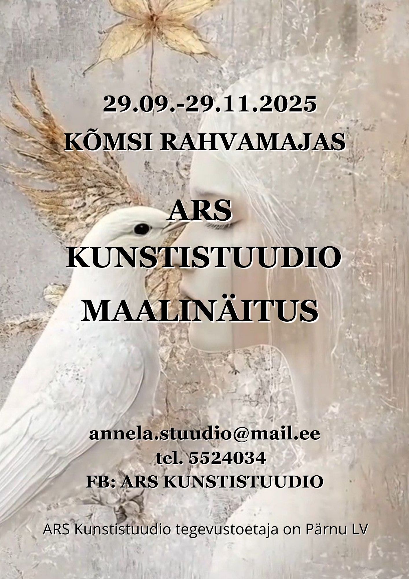 Kirjeldus: Kõmsi Rahvamaja väikeses saalis on vaatamiseks imekaunis ARS Kunstistuudio maalinäitus. ARS Kunstistuudio tegutseb Pärnus ja nende tegevustoetaja on Pärnu LV. Soovi korral on võimalik ka maalide soetamine (kontaktinfo plakatil)