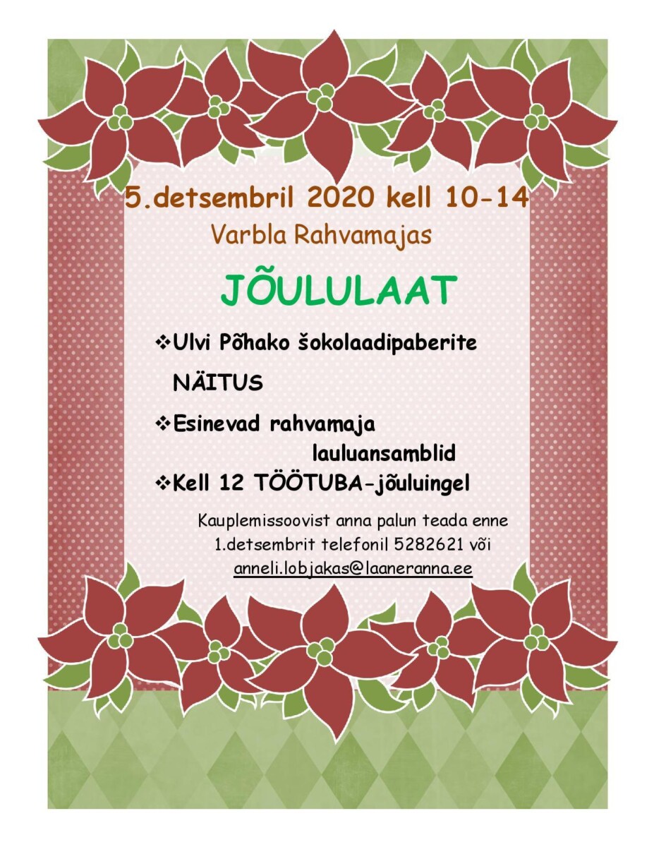 Avatud Ulvi Põhako šokolaadipaberite näitus, esinevad rahvamaja lauluansamblid ning kell 12:00 töötuba– jõuluingel.