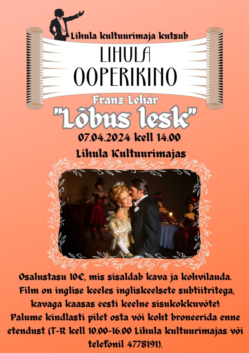 Lihula Kultuurimajas toimub 07.04.2024 ooperikino. Näitame Franz Lehàri “Lõbus lesk”. Etendus oli Meti laval 2015. aastal. Osalustasu 10€, mis sisaldab kava ja etenduse vaheajal kohvilauda. Film on inglise keeles ingliskeelsete subtiitritega, kavaga kaasas eesti keelne sisukokkuvõte!